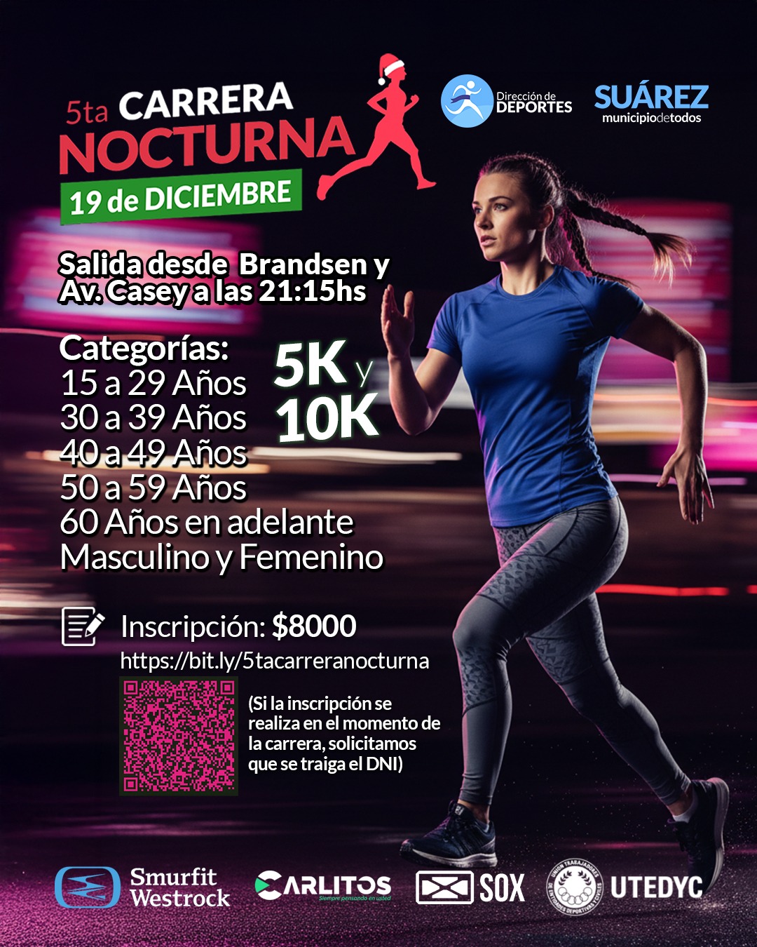 Organizada por la dirección de Deportes del Municipio de Coronel Suárez y por quinto año consecutivo, te invitamos a sumarte a la gran noche del deporte en Coronel Suárez con circuitos de 5 km y 10 km para cerrar el año y recibir el 2026 ¡con toda la actitud! .