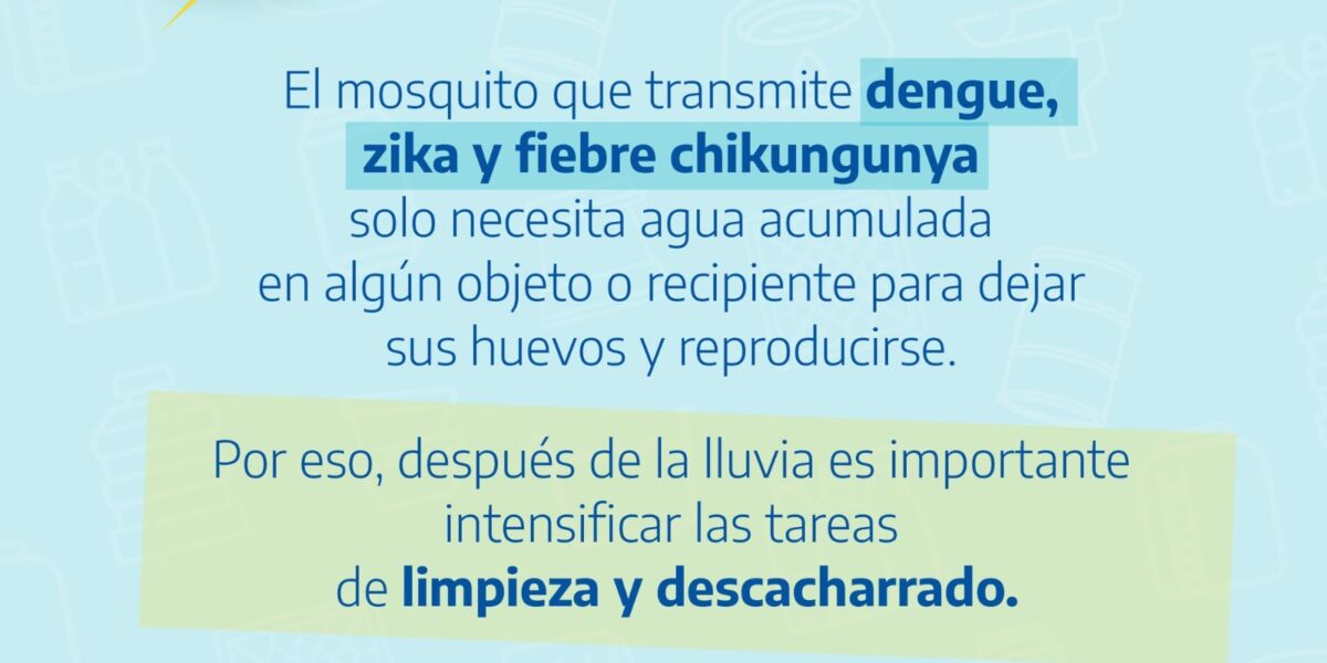 La acumulación de agua y humedad genera el microclima perfecto para la reproducción del Aedes Aegypti, mosquito trasmisor del dengue. Por eso… ¡Después de las lluvias es clave descacharrar! Mediante tareas simples podemos evitar que el mosquito se reproduzca: tapá, girá, lavá o tirá los objetos que puedan acumular agua, mantené limpias las canaletas y el jardín desmalezado.