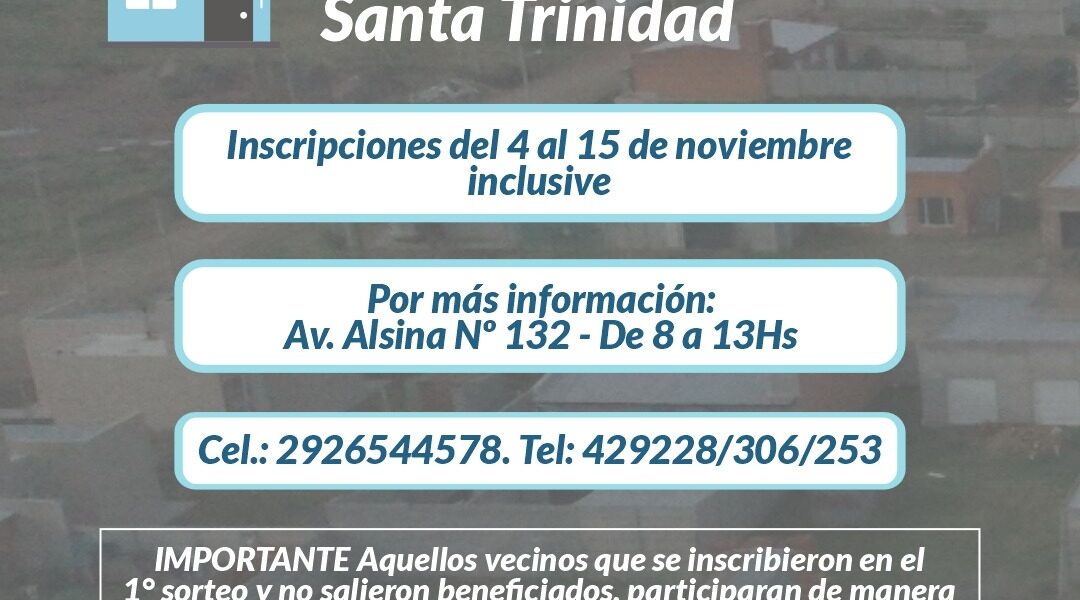 Con el compromiso asumido del Intendente Ricardo Moccero de trabajar en forma conjunta con aquellas vecinas que necesitan un terreno para edificar su vivienda, a partir del 4 y hasta el 15 de noviembre inclusive, los interesados en participar del sorteo de lotes en Santa Trinidad podrán inscribirse en el Instituto de la Vivienda (avenida Alsina 132) en el horario