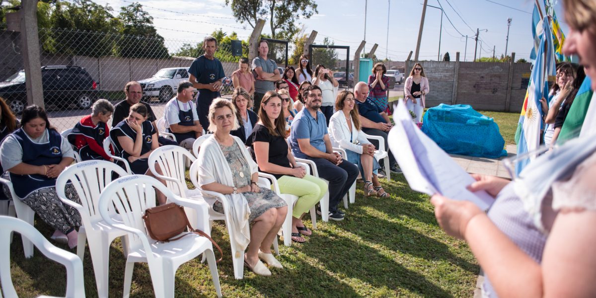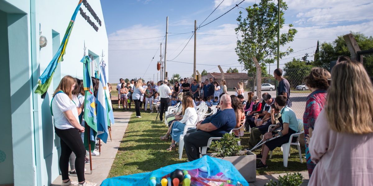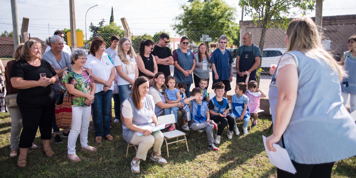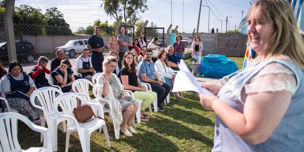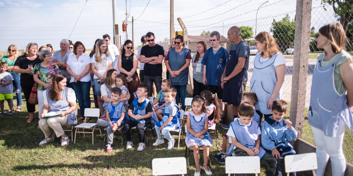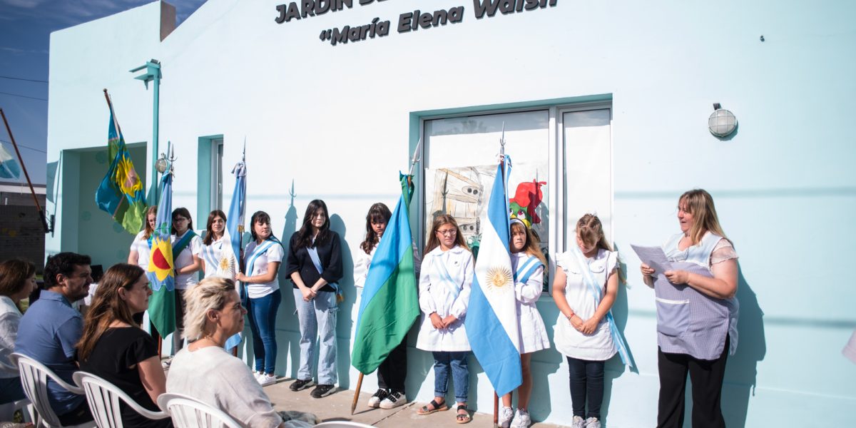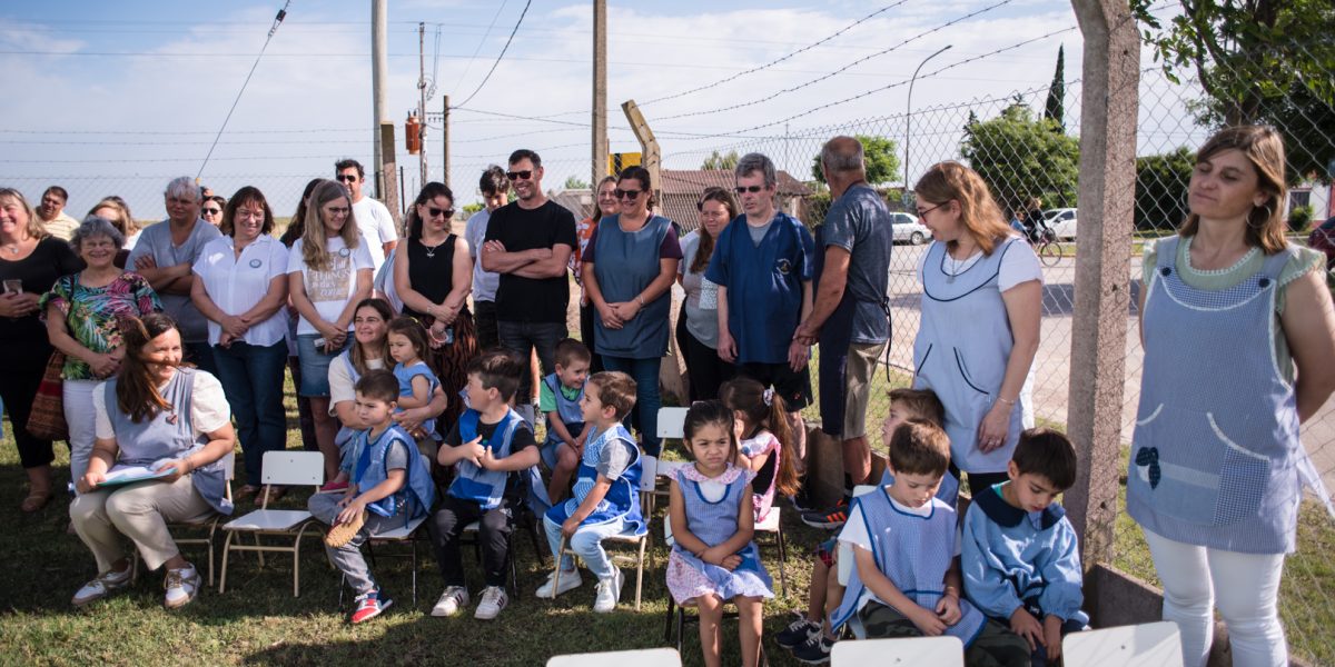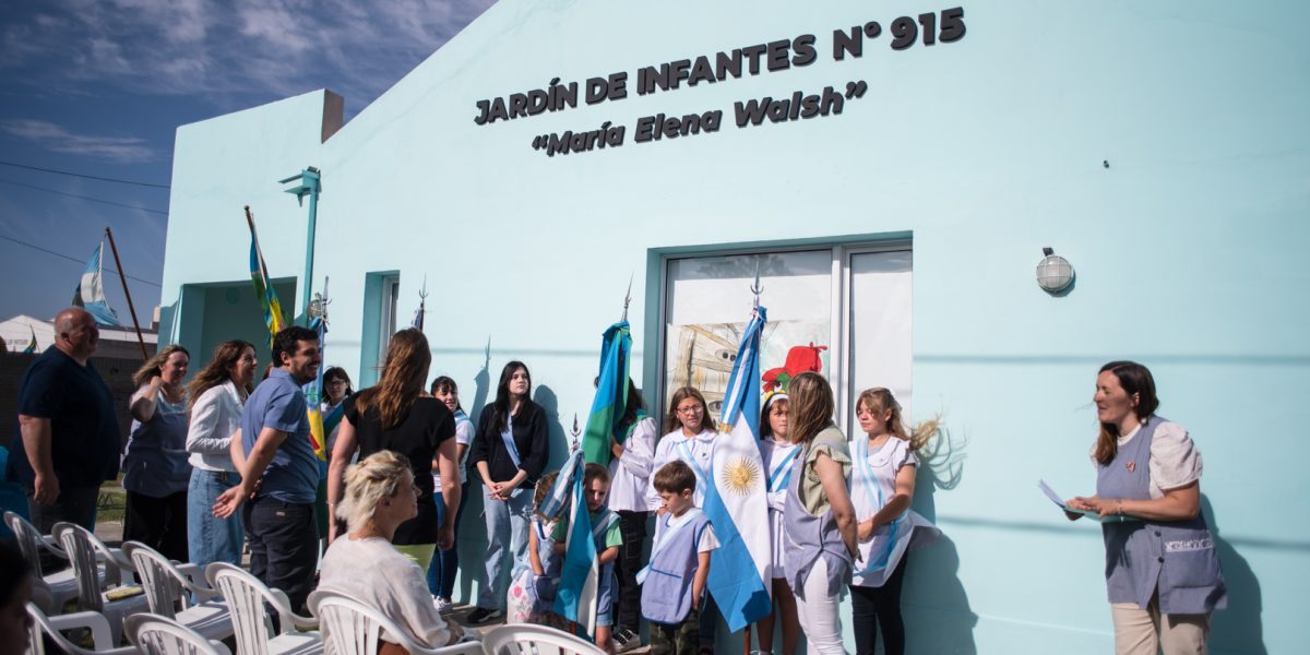 El concejal Mauro Moccero en representación del Intendente Ricardo Moccero junto a la Jefa Distrital de Educación Andrea Acosta; acompañó este martes 11 de noviembre a la comunidad educativa del Jardín N° 915 de Pueblo Santa María en la imposición del nombre “María Elena Walsh”. En la oportunidad, la directora del establecimiento Victoria Stein explicó a los niños y las