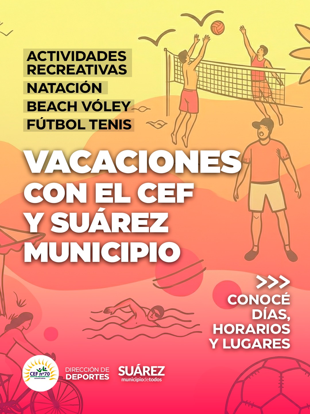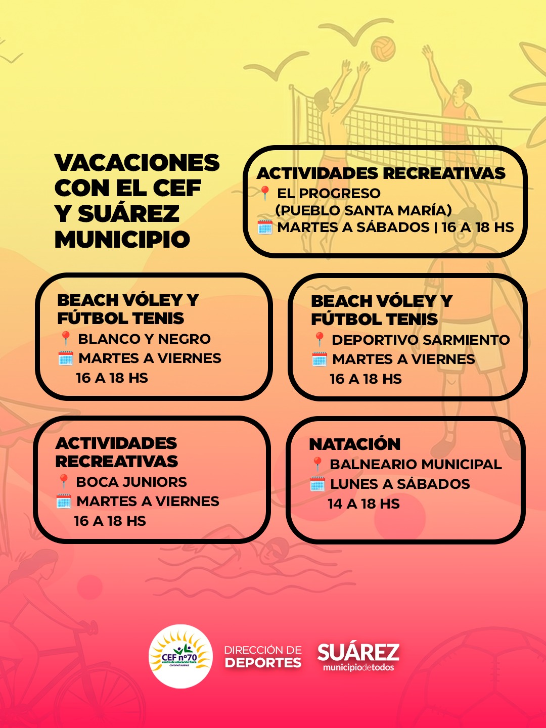 Actividades recreativas, natación, beach vóley y fútbol tenis formarán parte de las propuestas que estarán a cargo del equipo de profesores del CEF N.º 70, coordinado por la profesora Analía Daher, junto al director de Deportes Andrés “Piti” Mauri, en distintos clubes y espacios de la ciudad.