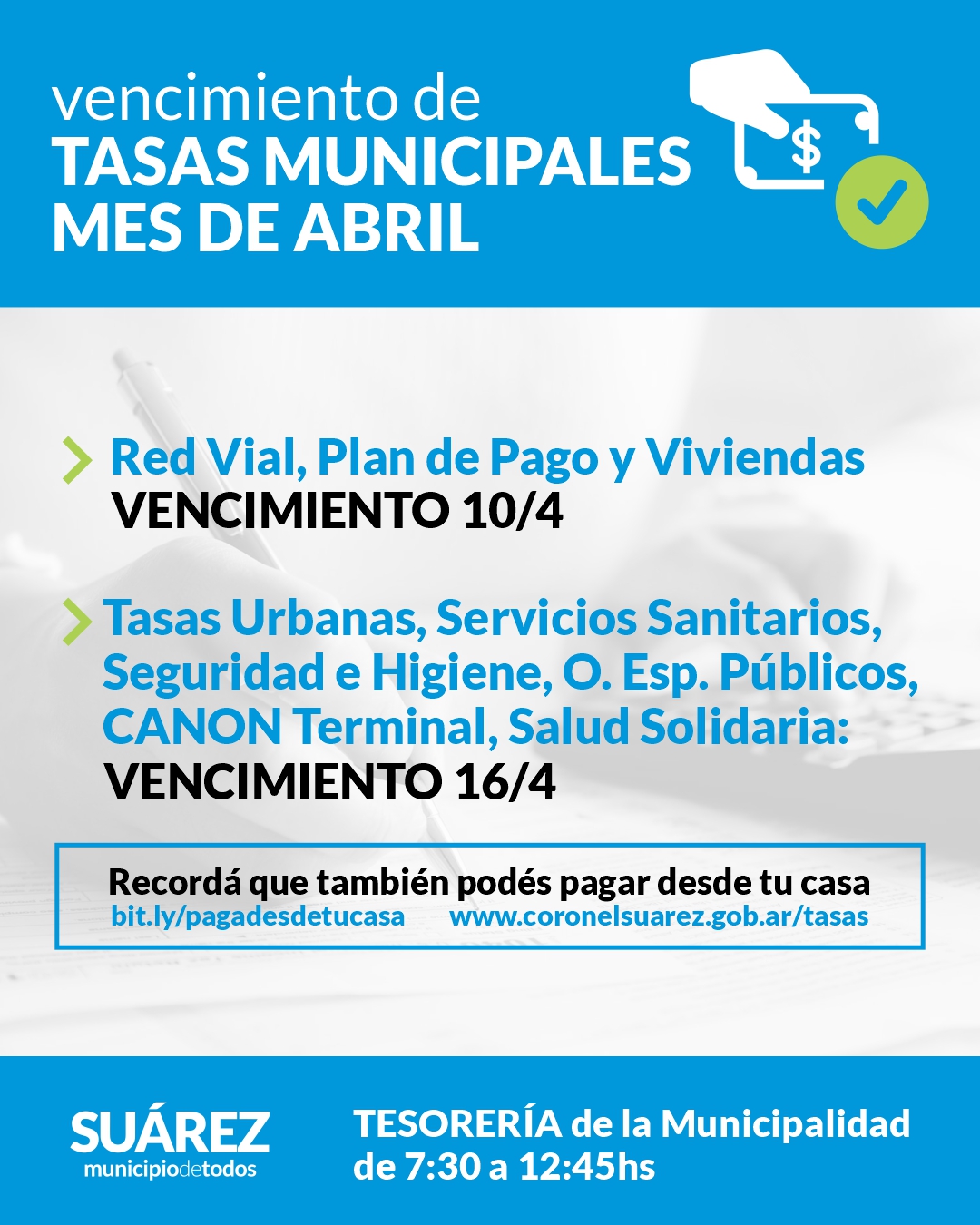 Podés abonar desde tu casa https://www.coronelsuarez.gob.ar/tasas/ o en forma presencial en Tesorería de la Municipalidad de Coronel Suárez de 7:30 a 12:45.-